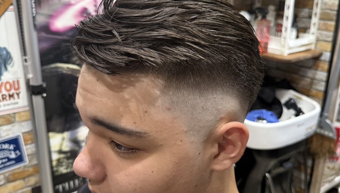 こちらはアイパーをベースにしてバーバースタイルにスキンフェードを組み合わせたスタイル