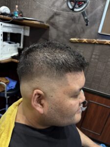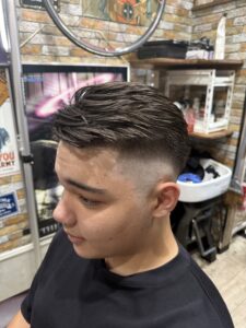 まだまだ暑い事もありますので汗をかいた場合にすぐにタオルで拭き取れるようにサイドと後ろは高めのスキンフェードをいれ、トップは前流しのクロップスタイル。